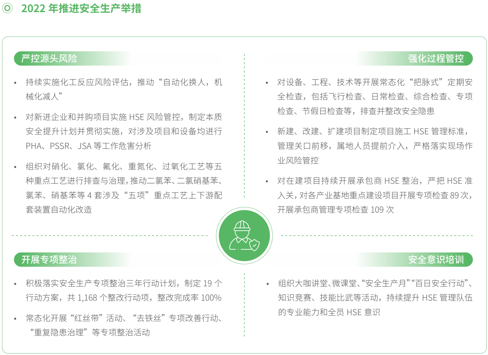中化国际以风险管控为核心,加大本质安全投入,对公司新、改、扩建项目从设计源头上落实本质安全,对项目和设备均进行工作危害分析和反应风险评估,全面排查职业病危害因素,提升员工安全防护水平,对各方提出的改进建议落实情况进行评估完善,全方位提升本质安全水平。