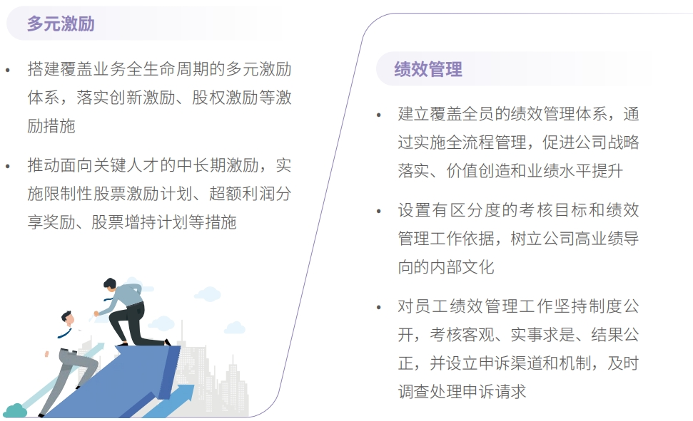 公司实施全面绩效管理,建立覆盖短、中、长期的多元激励机制,将员工激励与员工 的责任、能力和贡献直接紧密挂钩,有效提升员工发展能力和创造业绩的积极性。
