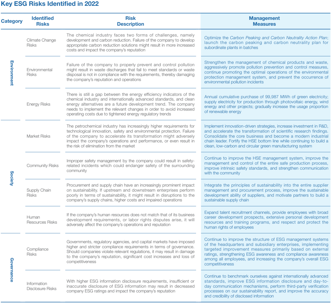The company incorporate ESG risk identification into its routinized risk management system, whereby the Board of Directors will be wholly responsible for the decision making and supervision of ESG risks. An audit and risk committee established under the Board of Directors is responsible for assessing the impact of ESG risks on the company’s operations and finances and supervising the effectiveness of risk management system operations. The company continues to monitor ESG risks against the backdrop of policy guidelines, environmental risks or social changes. It systematically identifies risk factors and formulates targeted management measures in order to effectively control and avoid the impact that the risks could bring to the business and operations.